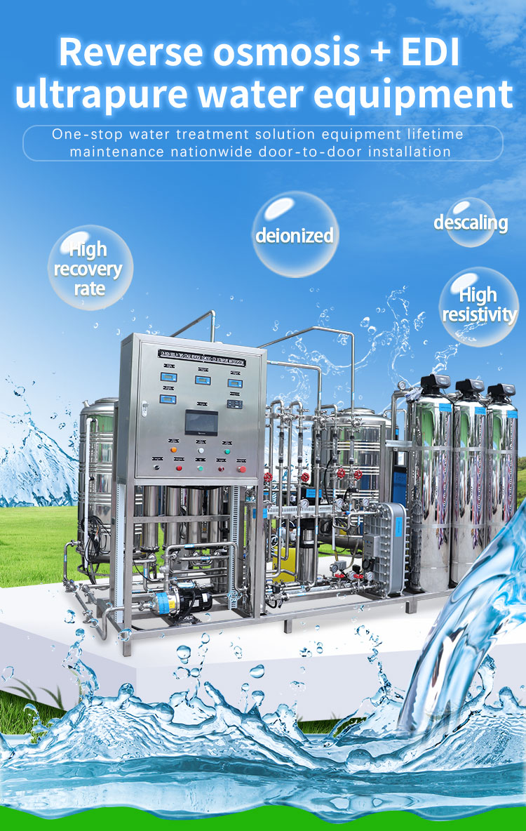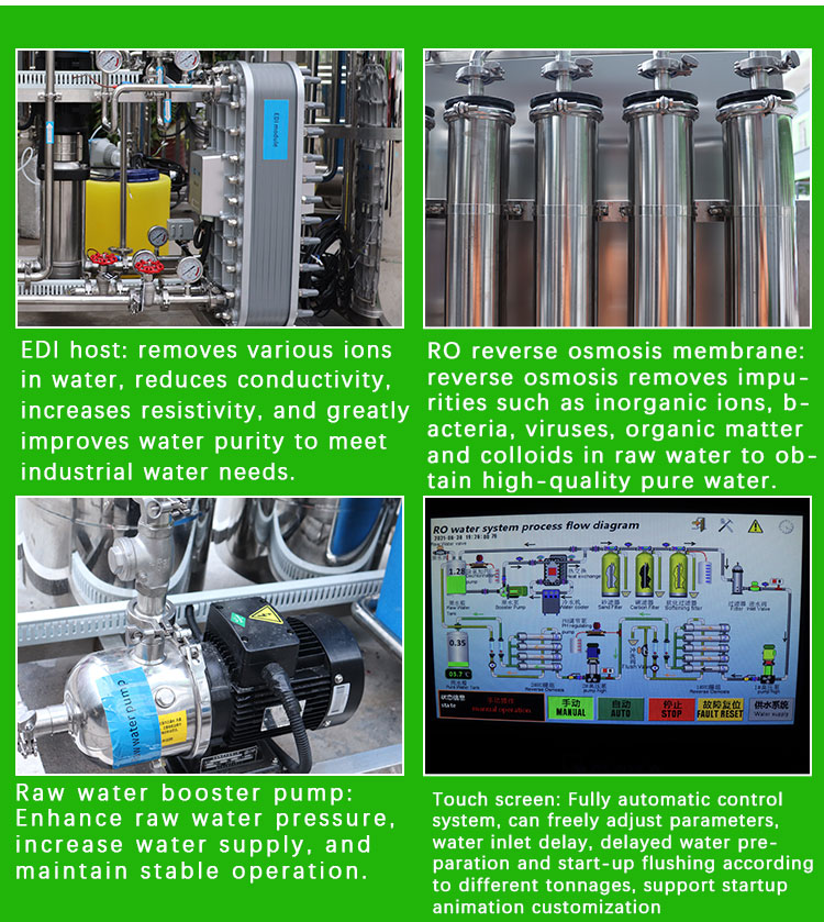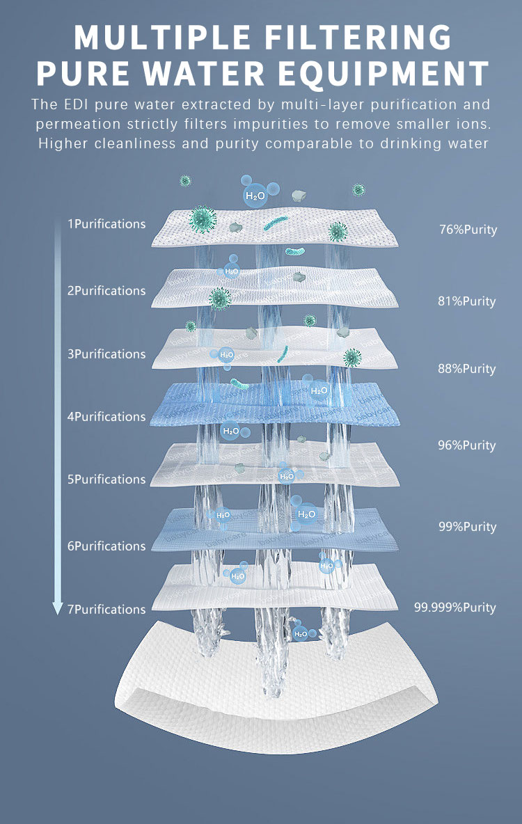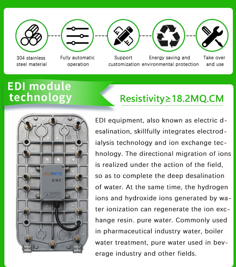 The EDI membrane stack mainly consists of alternating cation exchange membranes, concentrated water chambers, anion exchange membranes, fresh water chambers, and positive and negative electrodes. Under the action of a direct current electric field, cations and anions in the ion exchange resin in the fresh water chamber migrate towards the negative and positive electrodes along the channels formed by the resin and membrane, respectively. Cations pass through the cation exchange membrane, while anions pass through the anion exchange membrane and enter the concentrated water chamber to form concentrated water. At the same time, cations and anions in EDI feed water exchange with hydrogen ions and Hydroxide ion ions in ion exchange resin to form Ultrapure water (high-purity water). The Ultralimit current makes a large number of hydrogen ions and Hydroxide ion ions generated by Electrolysis of water continuously regenerate the ion exchange resin. Traditional ion exchange requires chemical in