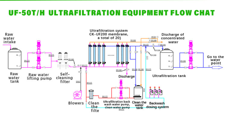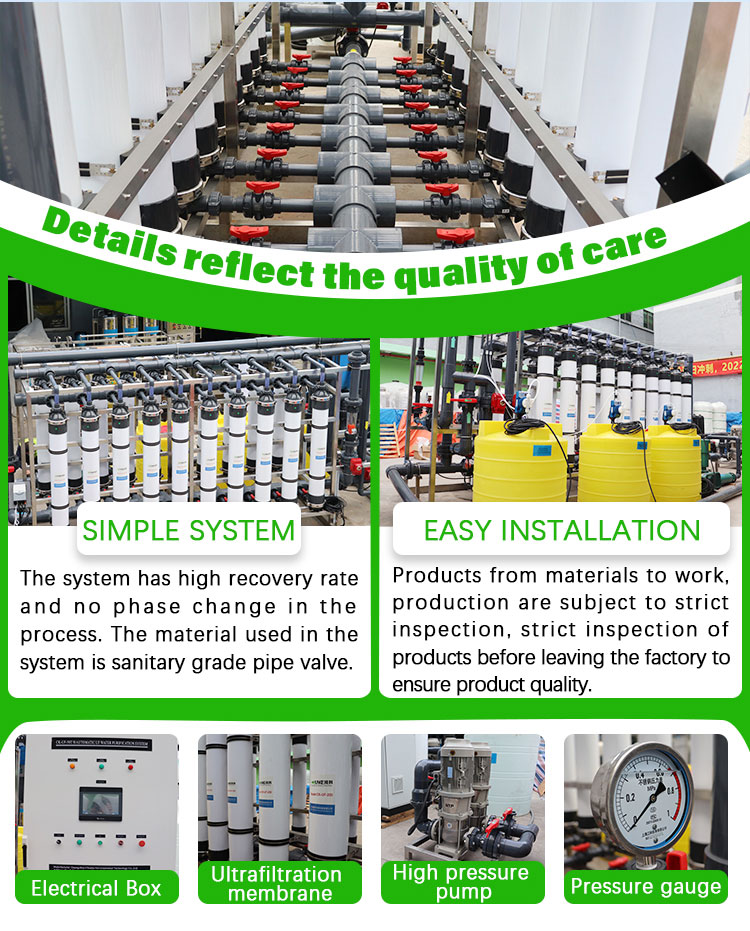 Ultra filtration (UF) is a membrane separation technology that can purify and separate solutions. The ultrafiltration membrane system is a solution separation device that uses ultrafiltration membrane filaments as the filtering medium and the pressure difference on both sides of the membrane as the driving force. The ultrafiltration membrane only allows the penetration of solvents (such as water molecules), inorganic salts, and small organic molecules in the solution, while intercepting the suspended solids, colloids, proteins, and microorganisms in the solution, thus achieving the purpose of purification or separation.