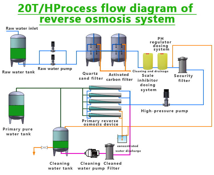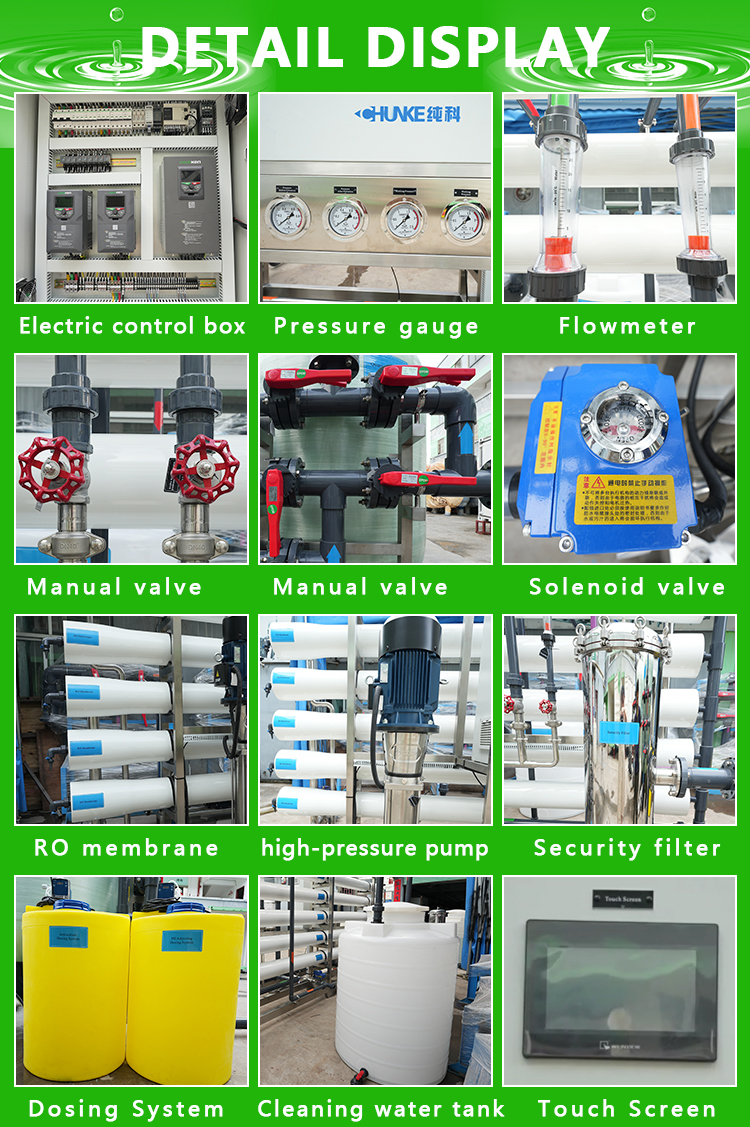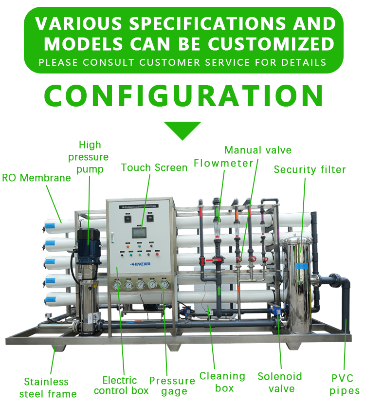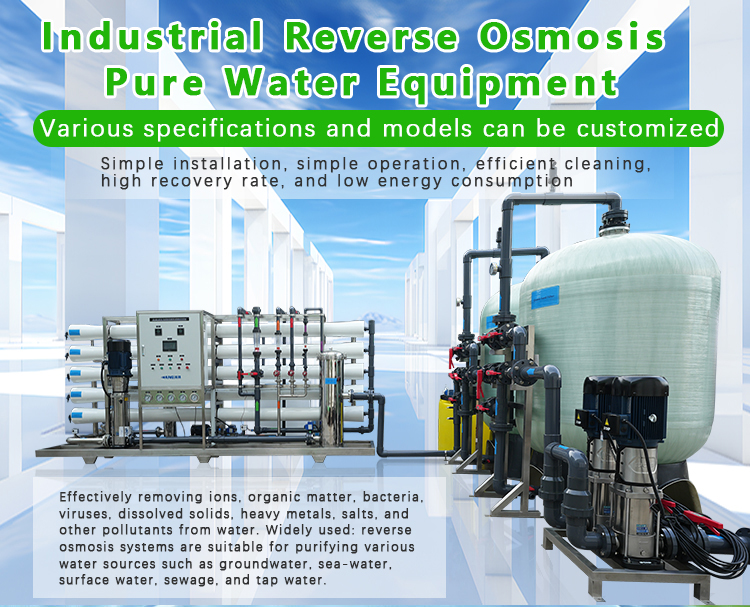 The reverse osmosis equipment passes the raw water through fine filters, granular activated carbon filters, compressed activated carbon filters, etc., and then pressurizes it through a pump, utilizing a pore size of 1/10000 μ The reverse osmosis membrane (RO membrane) of m (equivalent to 1/6000 of the size of Escherichia coli and 1/300 of the size of the virus) converts high concentration water into low concentration water, while isolating all impurities such as industrial pollutants, heavy metals, bacteria, viruses, etc. that have been mixed into the water, in order to meet the prescribed physical and chemical indicators and hygiene standards for drinking, and produce clean to pure water, It is the best choice for the human body to replenish high-quality water in a timely manner. Due to the fact that the water purity produced by RO reverse osmosis technology is currently the highest among all water production technologies mastered by humans, with a cleanliness of almost 100%, people c