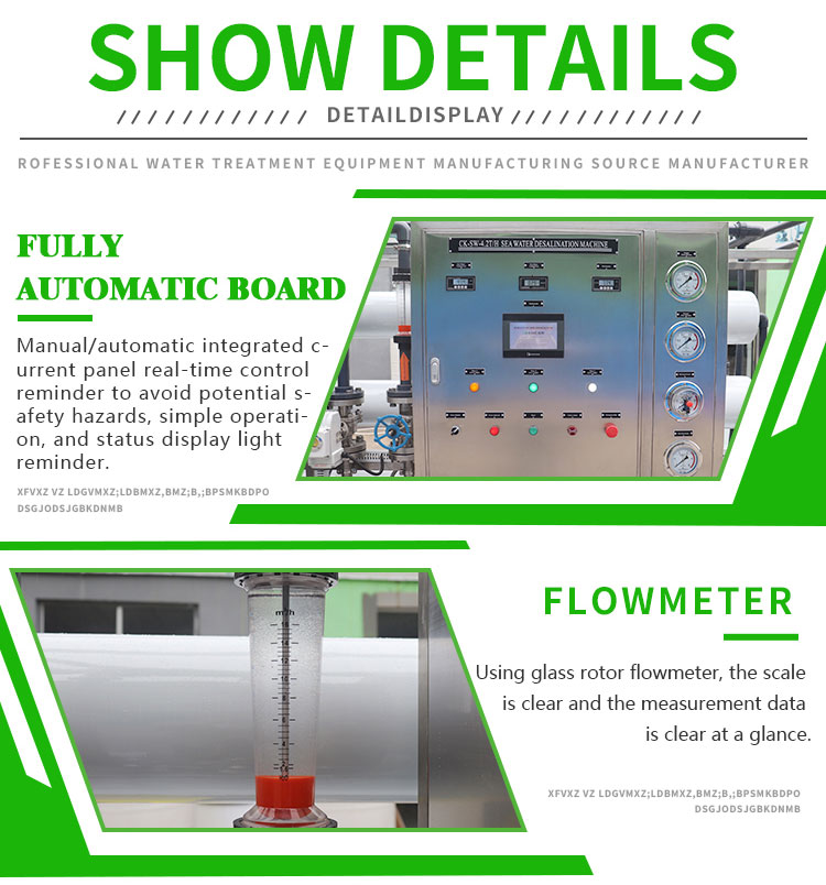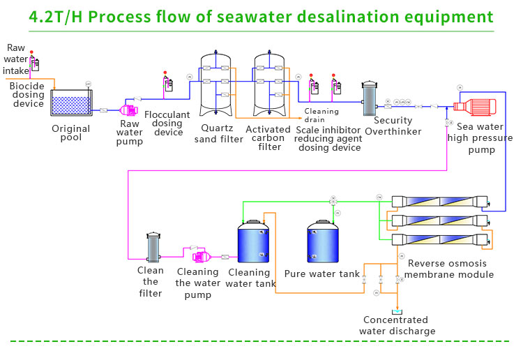 The seawater desalination equipment adopts reverse osmosis technology for desalination and desalination, which has many advantages such as wide applicability, moderate desalination scale, and short project construction time. Its main components include water intake system, pre-treatment system, seawater desalination desalination system, energy recovery system, chemical cleaning system, chemical dosing system, as well as device power supply and distribution and automatic control system.