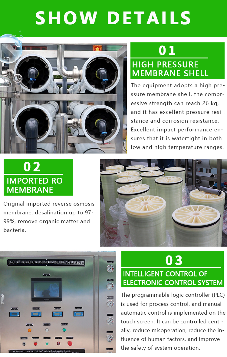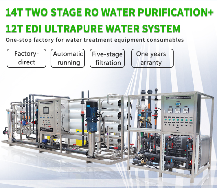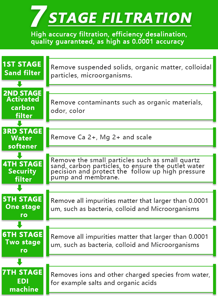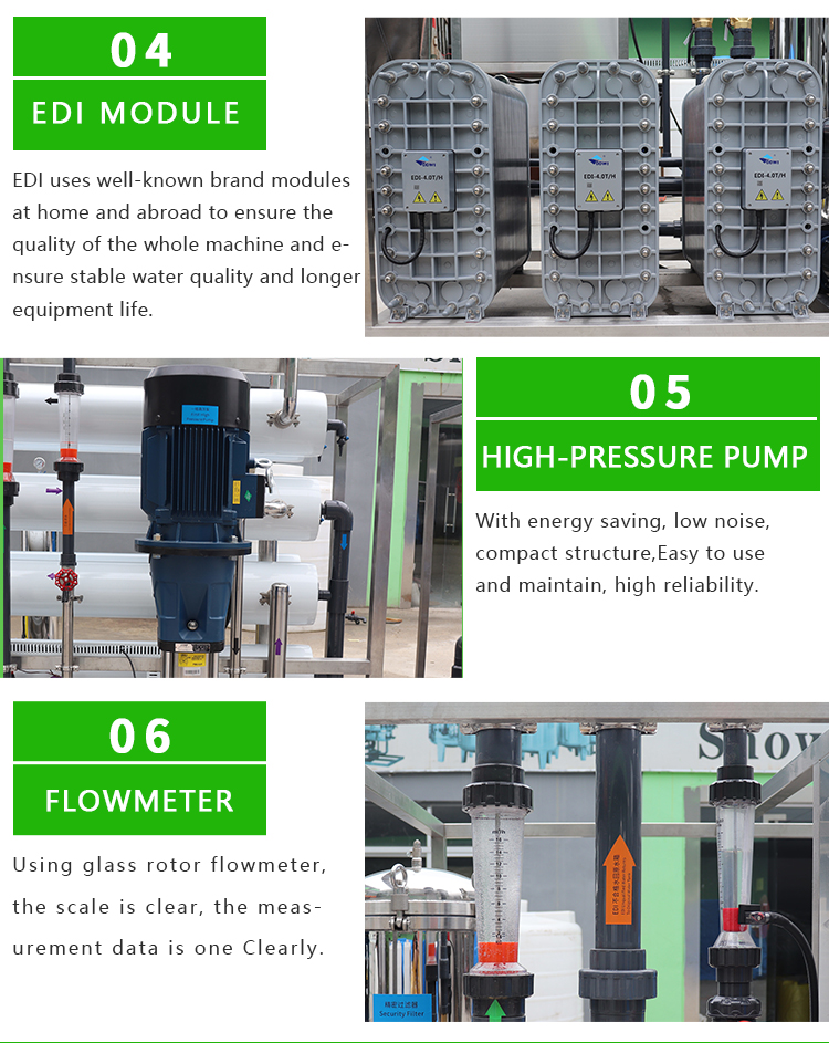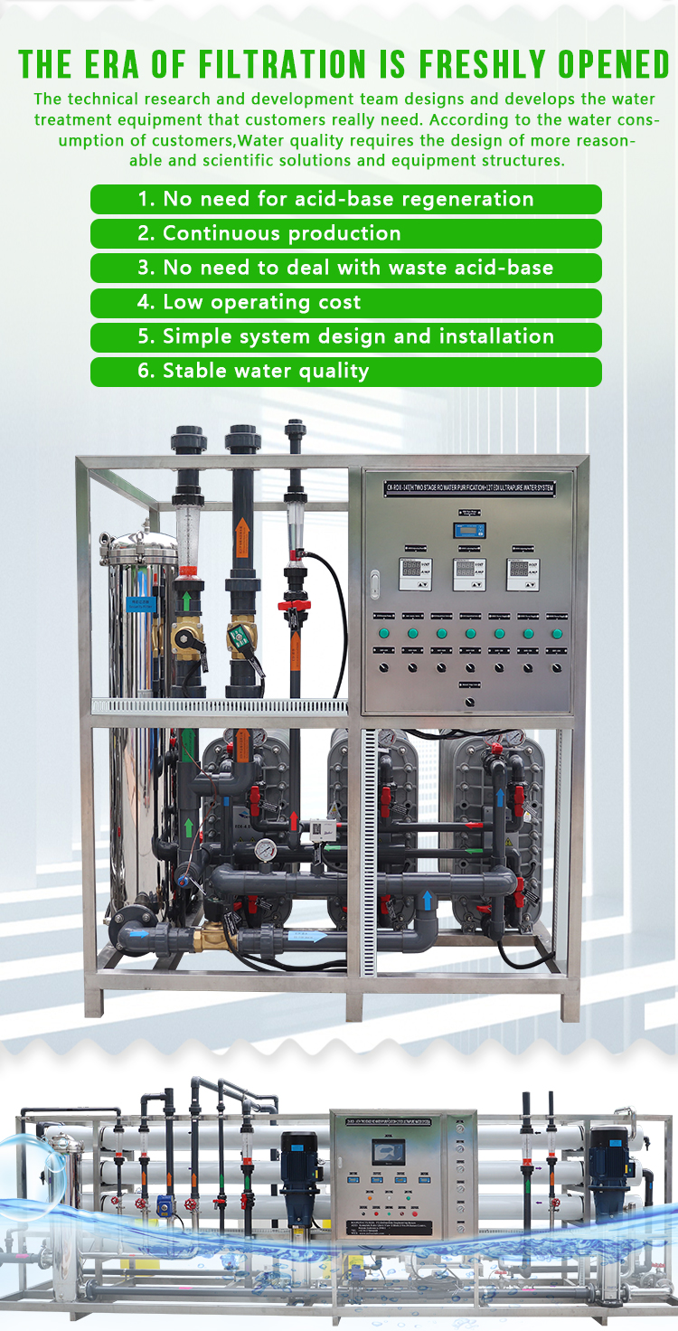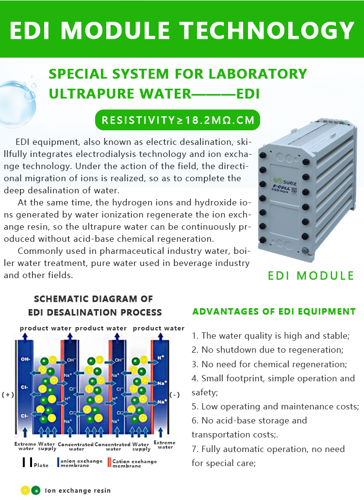 The EDI membrane stack mainly consists of alternating cation exchange membranes, concentrated water chambers, anion exchange membranes, fresh water chambers, and positive and negative electrodes. Under the action of a direct current electric field, cations and anions in the ion exchange resin in the fresh water chamber migrate towards the negative and positive electrodes along the channels formed by the resin and membrane, respectively. Cations pass through the cation exchange membrane, while anions pass through the anion exchange membrane and enter the concentrated water chamber to form concentrated water. At the same time, cations and anions in EDI feed water exchange with hydrogen ions and Hydroxide ion ions in ion exchange resin to form Ultrapure water (high-purity water). The Ultralimit current makes a large number of hydrogen ions and Hydroxide ion ions generated by Electrolysis of water continuously regenerate the ion exchange resin. Traditional ion exchange requires chemical in