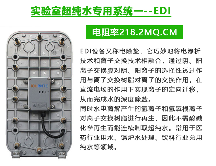 EDI超纯水处理设备具有连续出水、无需酸碱再生和无人值守等优点,已在制备纯水的系统中逐步代替混床作为精处理设备使用。 EDI超纯水处理设备的环保特性好,操作使用简便,愈来愈多地被人们所认可,也愈来愈多广泛地在医药、电子、电力、化工等行业得到推广。