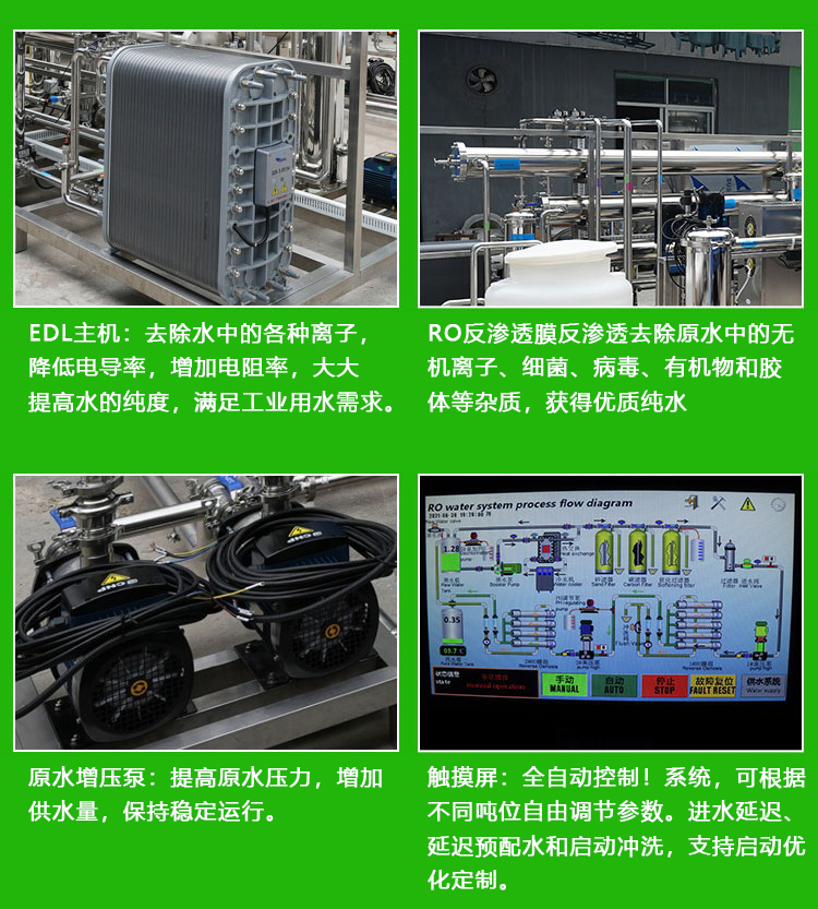 ●EDI设备运行更加的环保,没有酸液、碱液排放,可以节水节能合理会用全部的浓水。