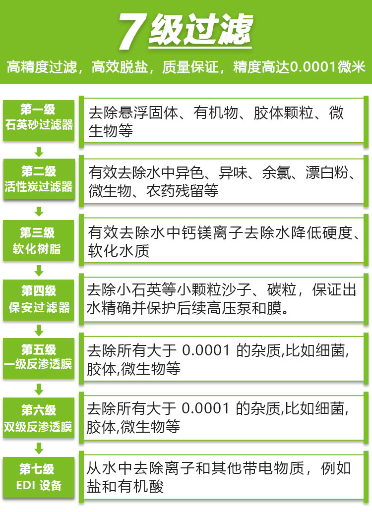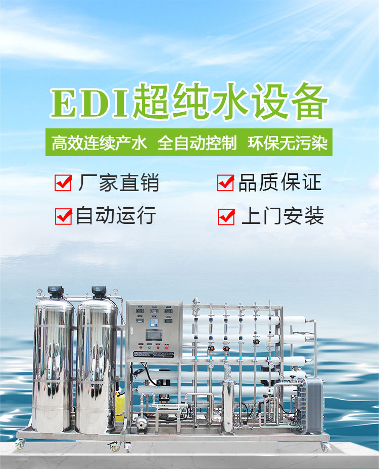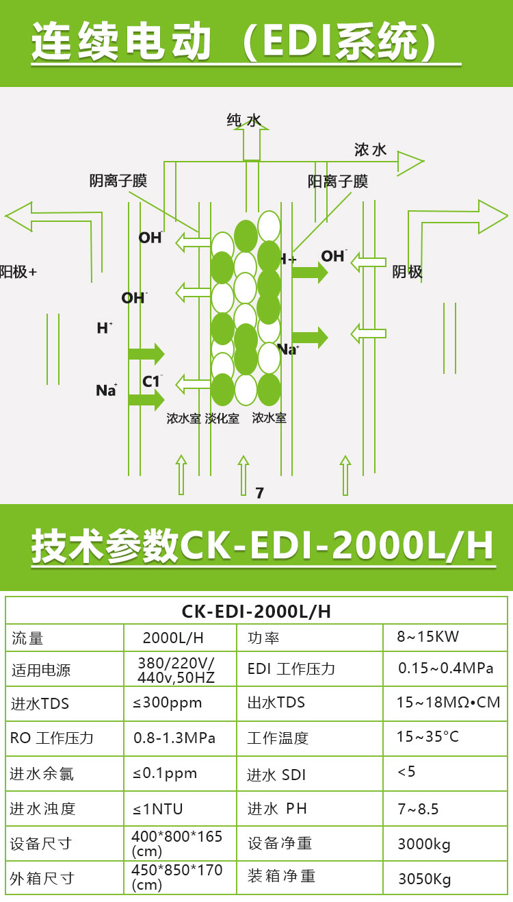 电去离子(EDI)系统主要是在直流电场的作用下,通过隔板的水中电介质离子发生定向移动,利用交换膜对离子的选择透过作用来对水质进行提纯的一种科学的水处理技术。电渗析器的一对电极之间,通常由阴膜,阳膜和隔板(甲、乙)多组交替排列,构成浓室和淡室(即阳离子可透过阳膜,阴离子可透过阴膜)。 淡室水中阳离子向负极迁移透过阳膜,被浓室中的阴膜截留;水中阴离子向正极方向迁移阴膜,被浓室中的阳膜截留,这样通过淡室的水中离子数逐渐减少,成为淡水,而浓室的水中,由于浓室的阴阳离子不断涌进,电介质离子浓度不断升高,而成为浓水,从而达到淡化、提纯、浓缩或精制的目的。