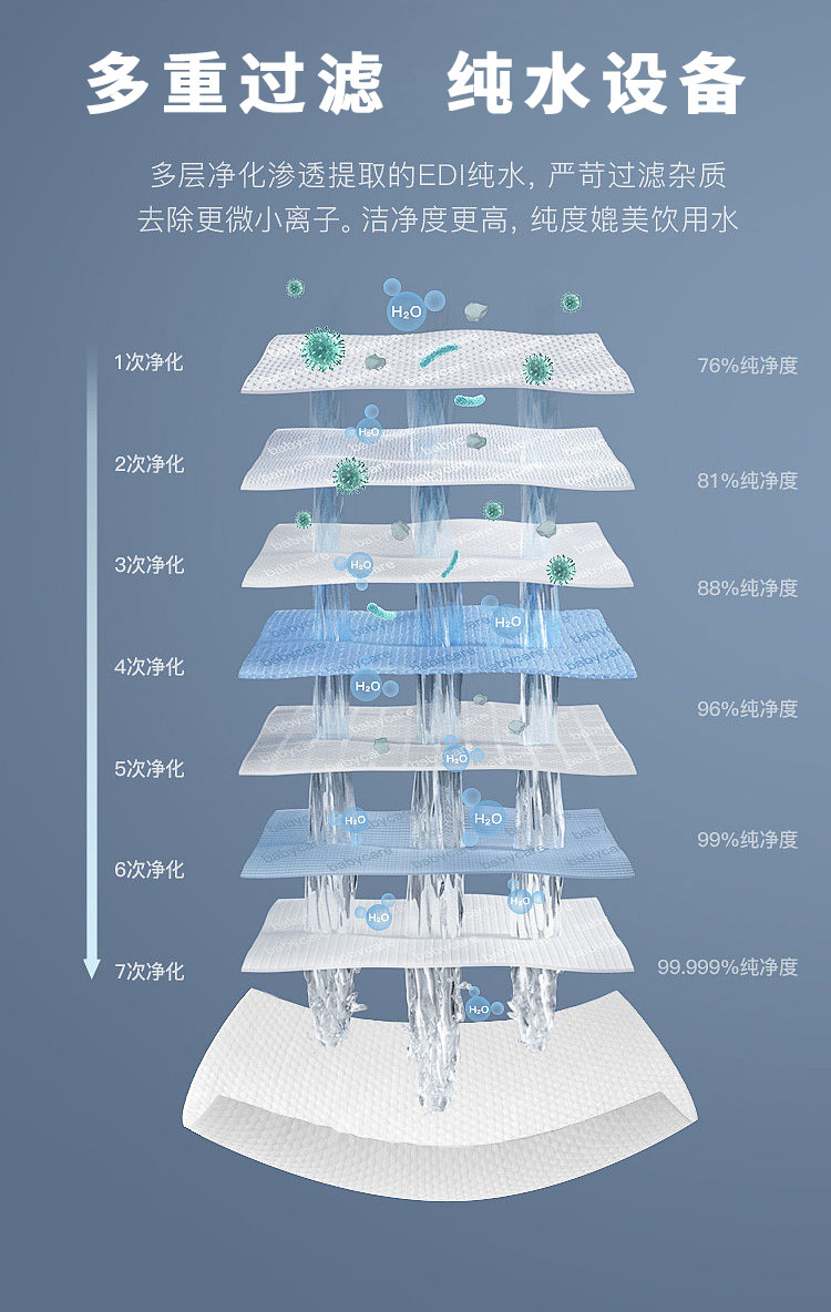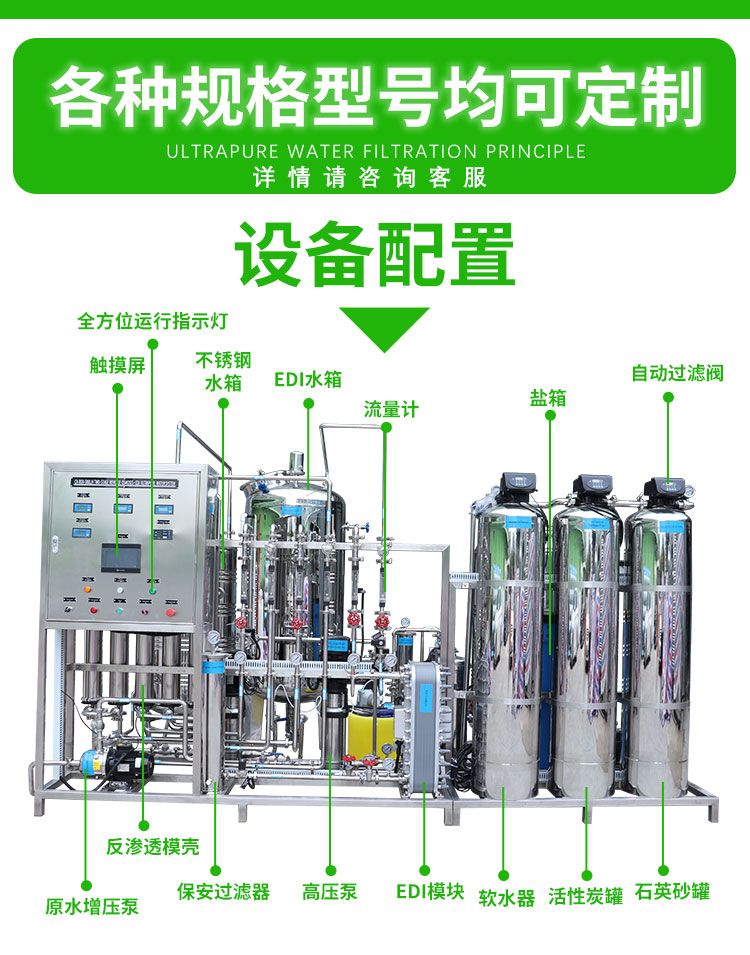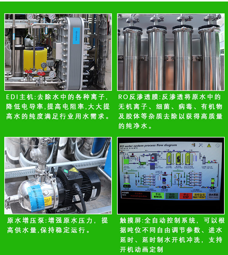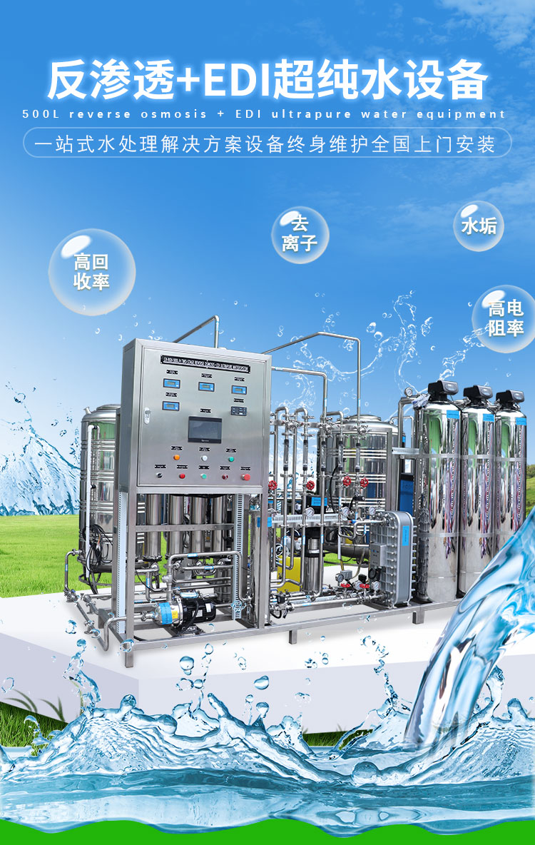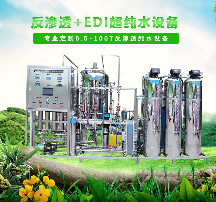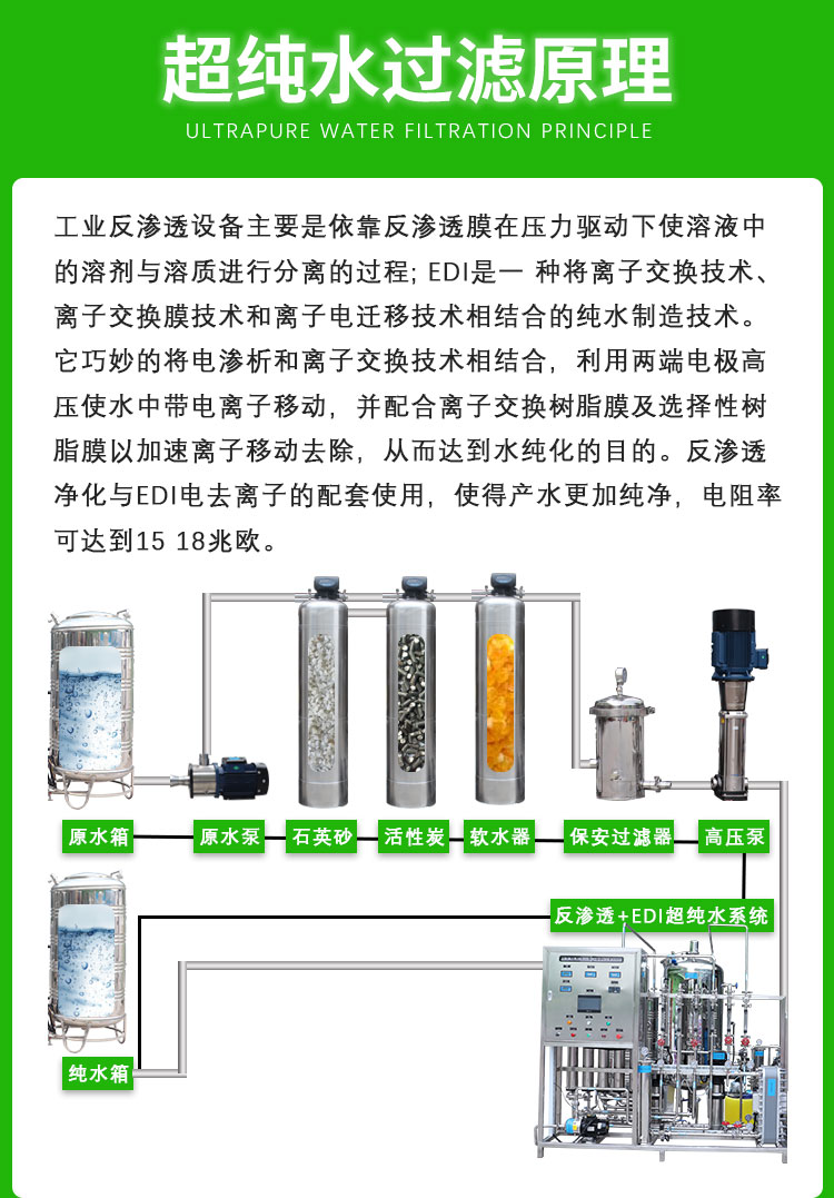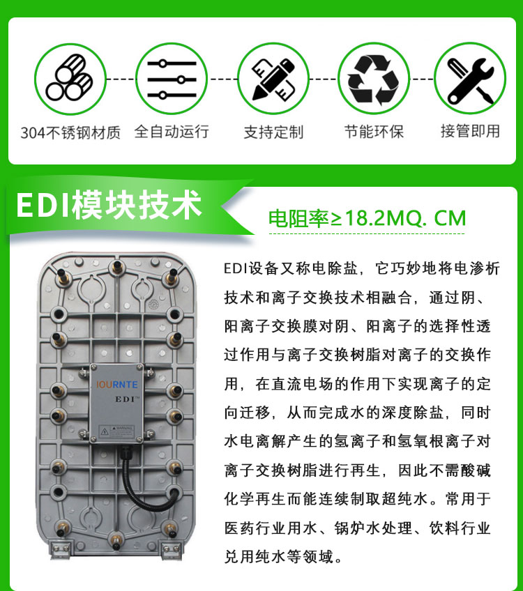 EDI膜堆主要由交替排列的阳离子交换膜、浓水室、阴离子交换膜、淡水室和正、负电极组成。在直流电场的作用下,淡水室中离子交换树脂中的阳离子和阴离子沿树脂和膜构成的通道分别向负极和正极方向迁移,阳离子透过阳离子交换膜,阴离子透过阴离子交换膜,分别进入浓水室形成浓水。同时EDI进水中的阳离子和阴离子跟离子交换树脂中的氢离子和氢氧根离子交换,形成超纯水(高纯水)。超极限电流使水电解产生的大量氢离子和氢氧根离子对离子交换树脂进行连续的再生。传统的离子交换,离子交换树脂饱和后需要化学间歇再生。而EDI膜堆中的树脂通过水的电解连续再生,工作是连续的,不需要酸碱化学再生。
