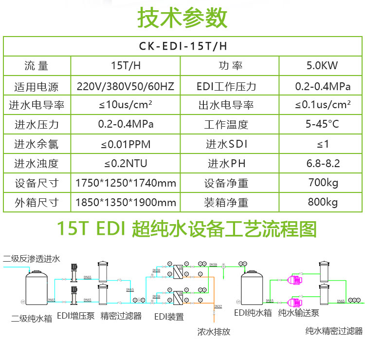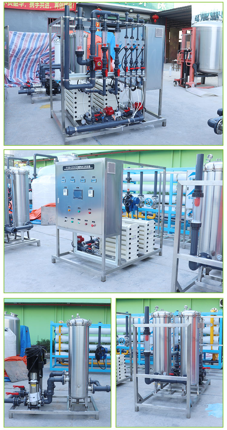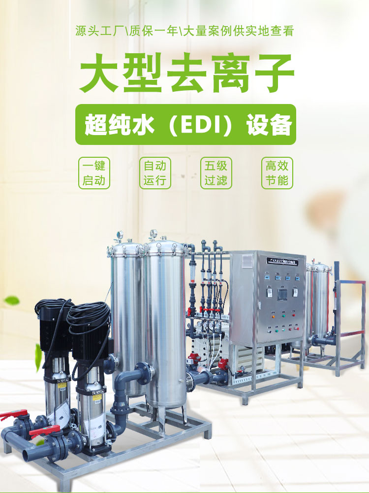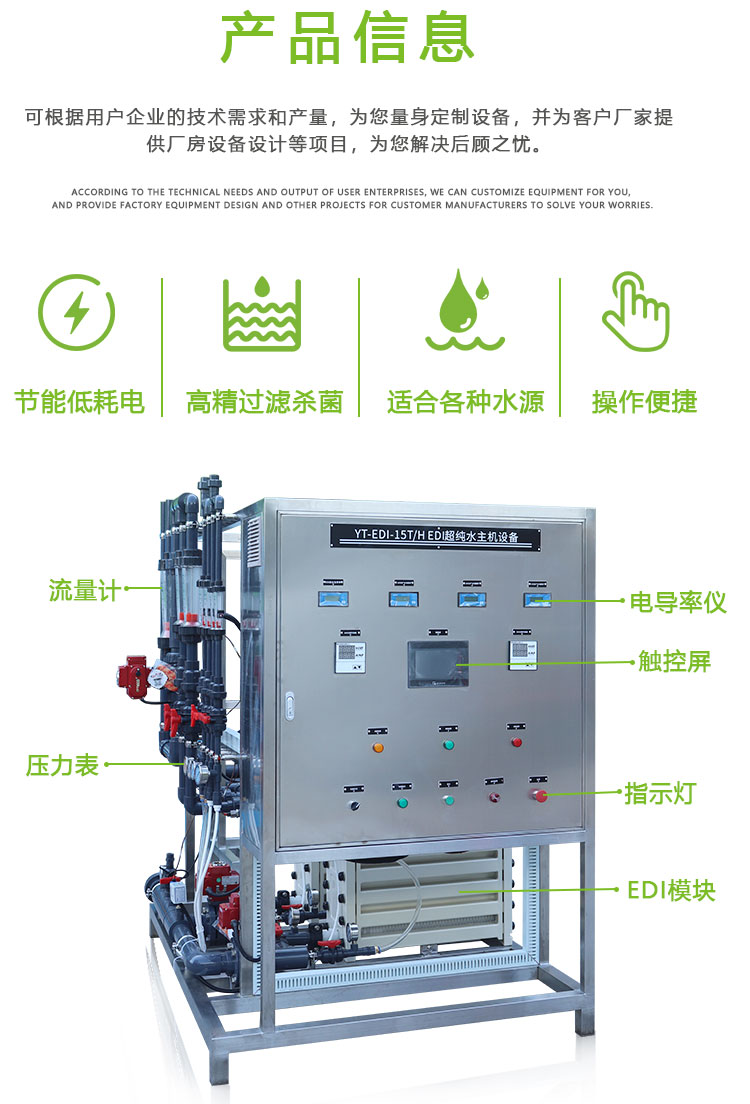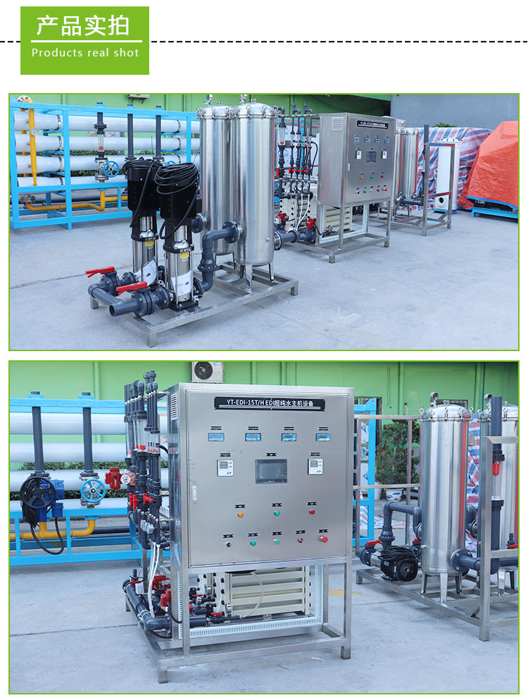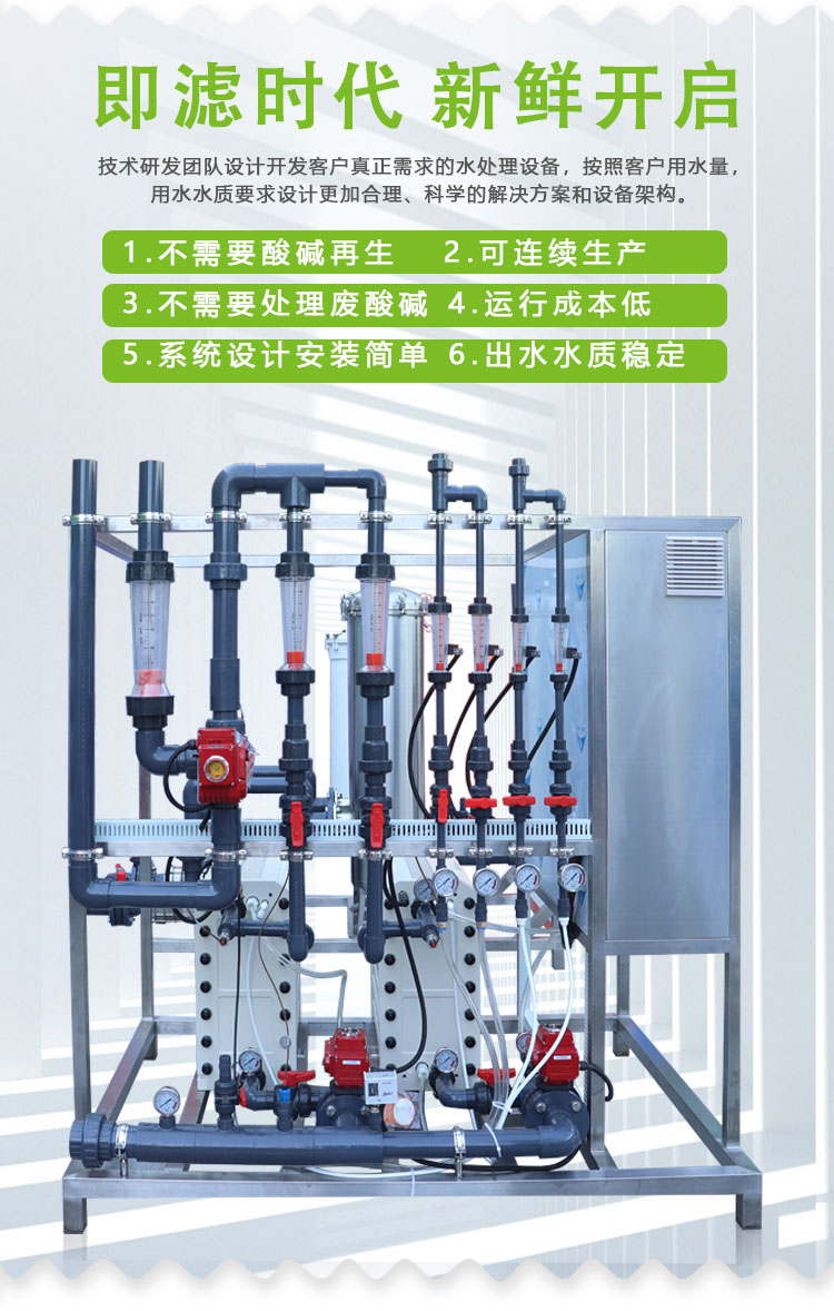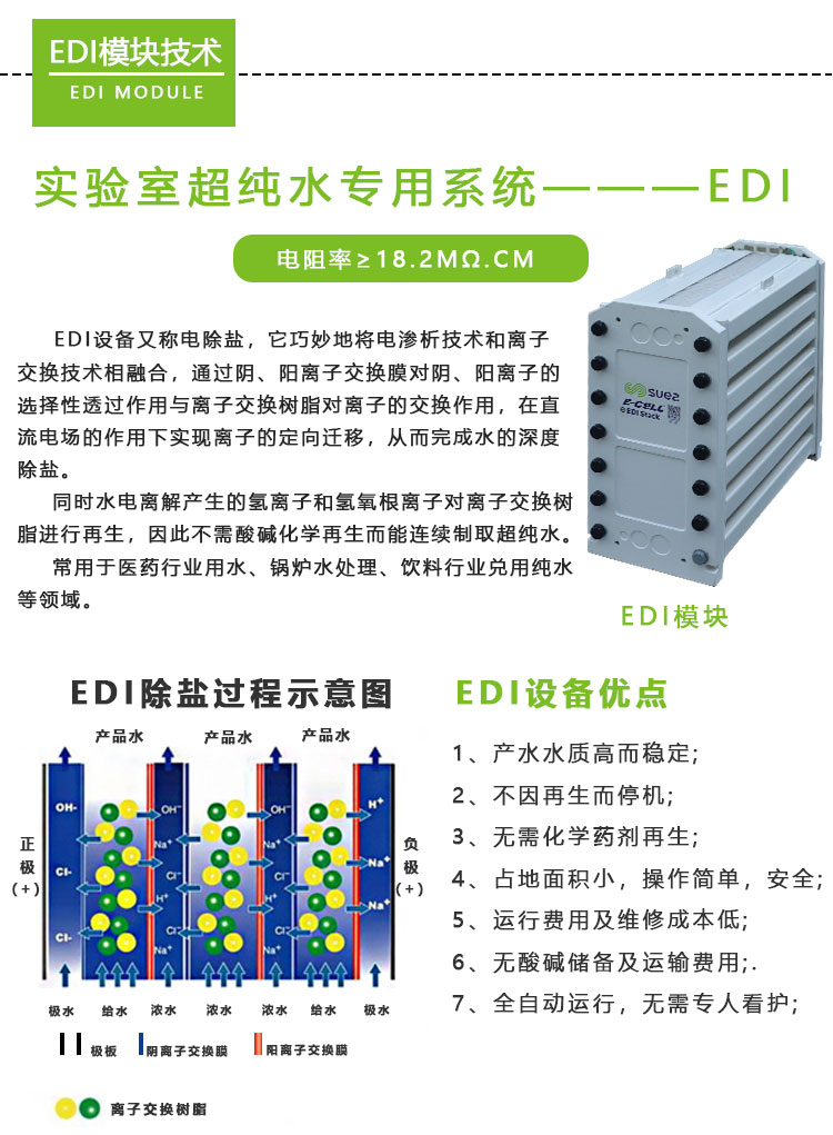 EDI膜堆主要由交替排列的阳离子交换膜、浓水室、阴离子交换膜、淡水室和正、负电极组成。在直流电场的作用下,淡水室中离子交换树脂中的阳离子和阴离子沿树脂和膜构成的通道分别向负极和正极方向迁移,阳离子透过阳离子交换膜,阴离子透过阴离子交换膜,分别进入浓水室形成浓水。同时EDI进水中的阳离子和阴离子跟离子交换树脂中的氢离子和氢氧根离子交换,形成超纯水(高纯水)。超极限电流使水电解产生的大量氢离子和氢氧根离子对离子交换树脂进行连续的再生。传统的离子交换,离子交换树脂饱和后需要化学间歇再生。而EDI膜堆中的树脂通过水的电解连续再生,工作是连续的,不需要酸碱化学再生。