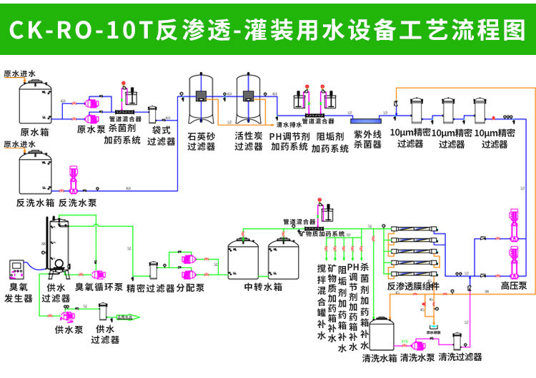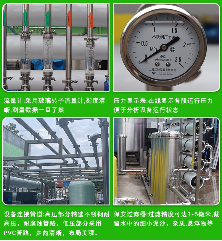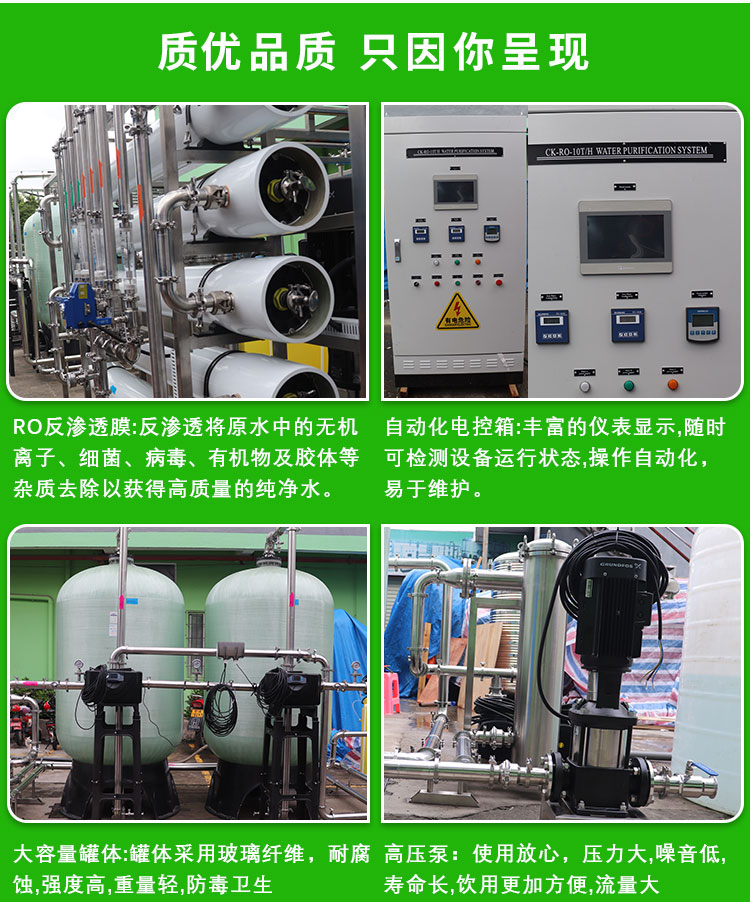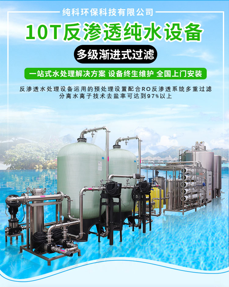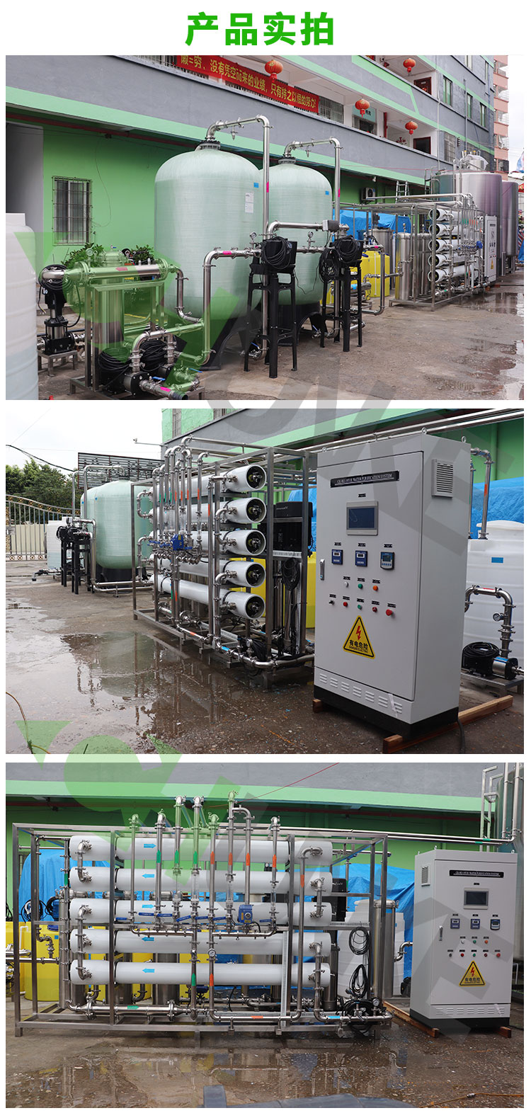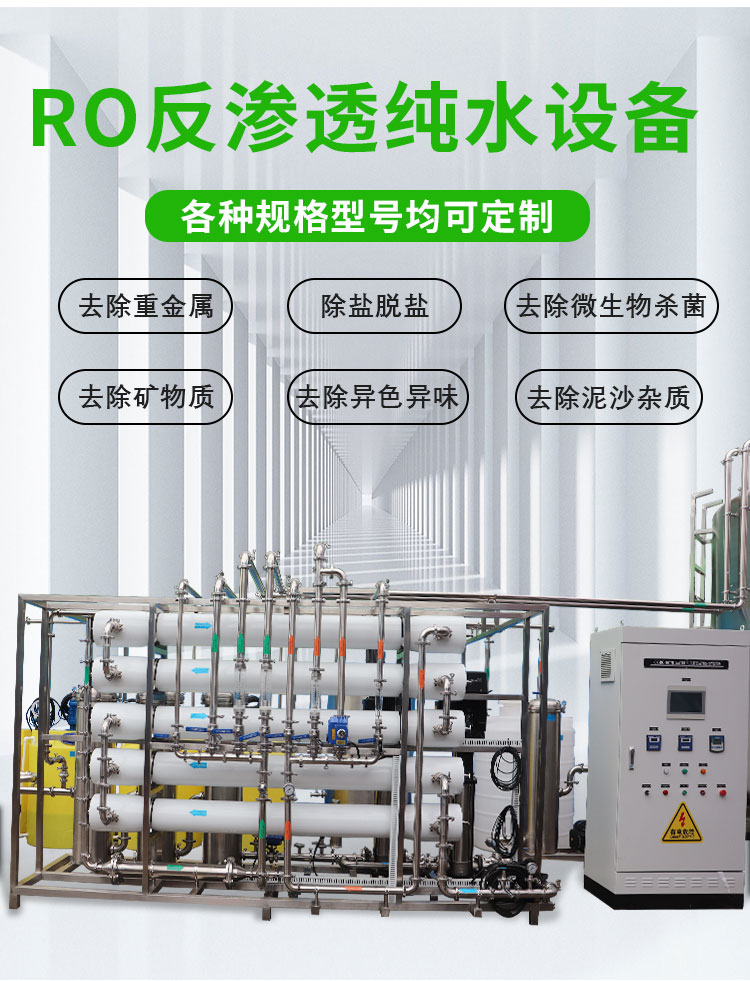 反渗透设备是将原水经过精细过滤器、颗粒活性碳过滤器、压缩活性碳过滤器等,再通过泵加压,利用孔径为1/10000μm(相当于大肠杆菌大小的1/6000,病毒的1/300)的反渗透膜(RO膜),使较高浓度的水变为低浓度水,同时将工业污染物、重金属、细菌、病毒等大量混入水中的杂质全部隔离,从而达到饮用规定的理化指标及卫生标准,产出至清至纯的水,是人体及时补充优质水分的最佳选择.由于RO反渗透技术生产的水纯净度是目前人类掌握的一切制水技术中最高的,洁净度几乎达到100%,所以人们称这种产水机器为反渗透纯净水机。 反渗透是一种现代新型的纯净水处理技术。通过反渗透元件来提高水质的纯净度,清除水中含有的杂质和盐。我们日常所饮用的纯净水都是经过反渗透设备处理的,水质清澈。