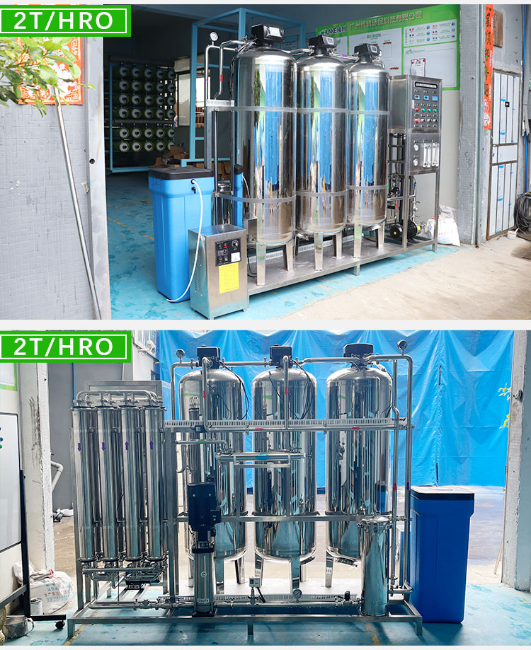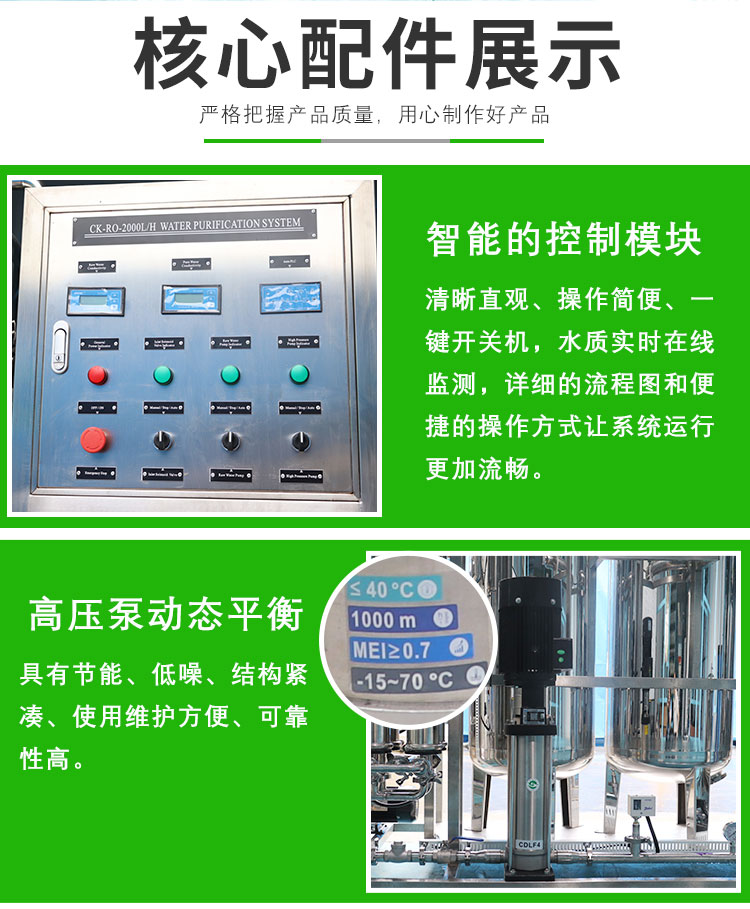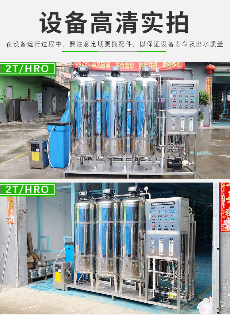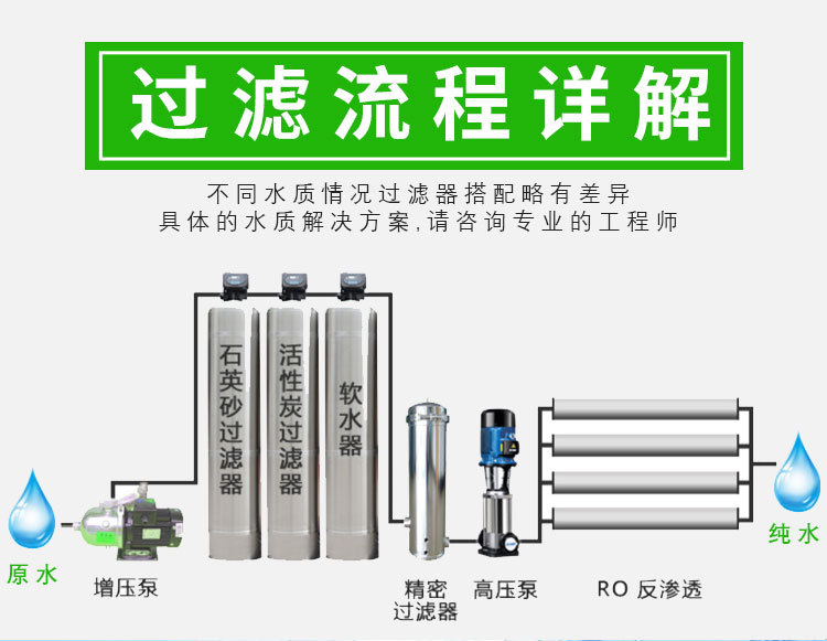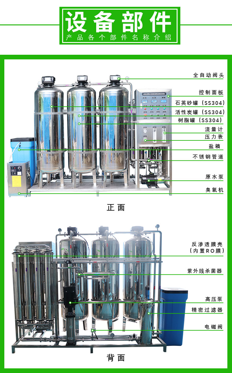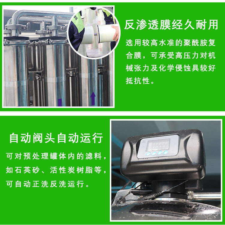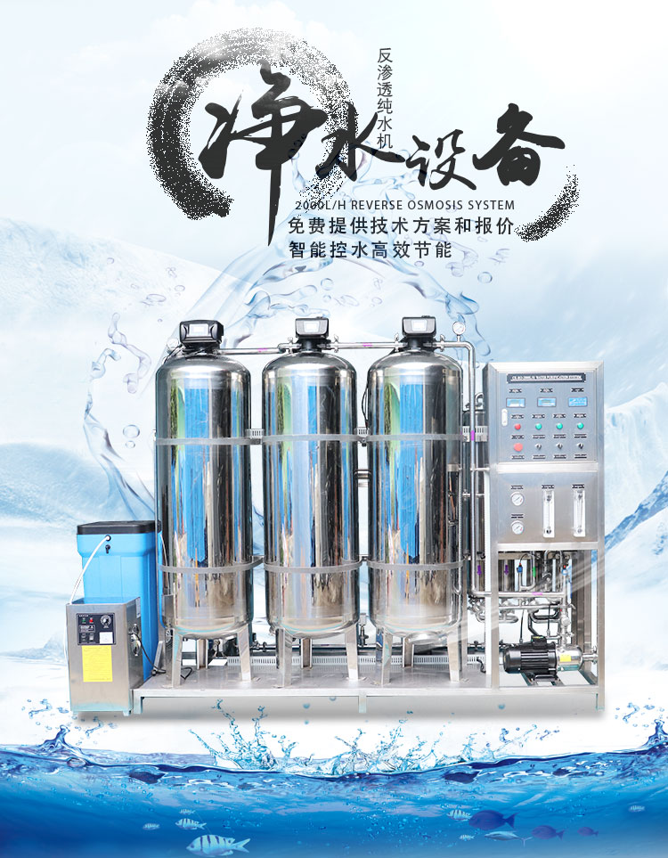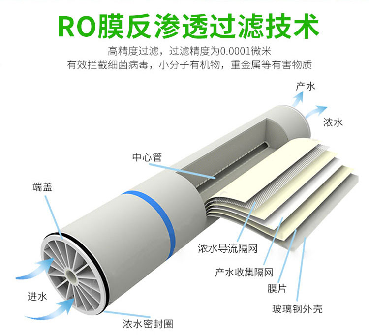反渗透是一种借助于选择透过(半透过)性膜的功能以压力为推动力的膜分离技术,当系统中所加的压力大于进水溶液渗透压时,水分子不断地透过膜,经过产水流道流入中心管,然后在一端流出水中的杂质,如离子、有机物、细菌、病毒等,被截留在膜的进水侧,然后在浓水出水端流出,从而达到分离净化目的。