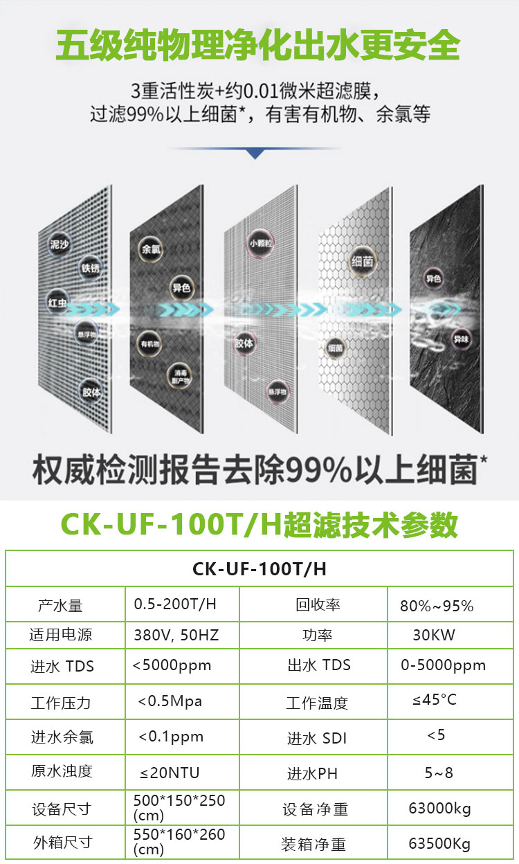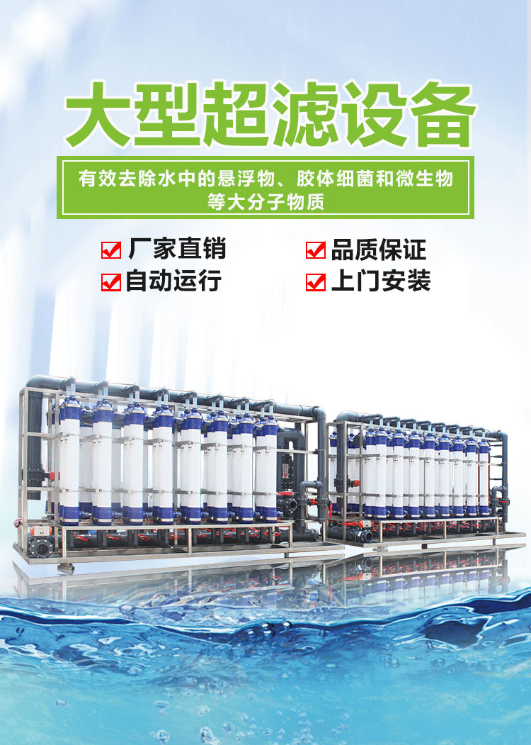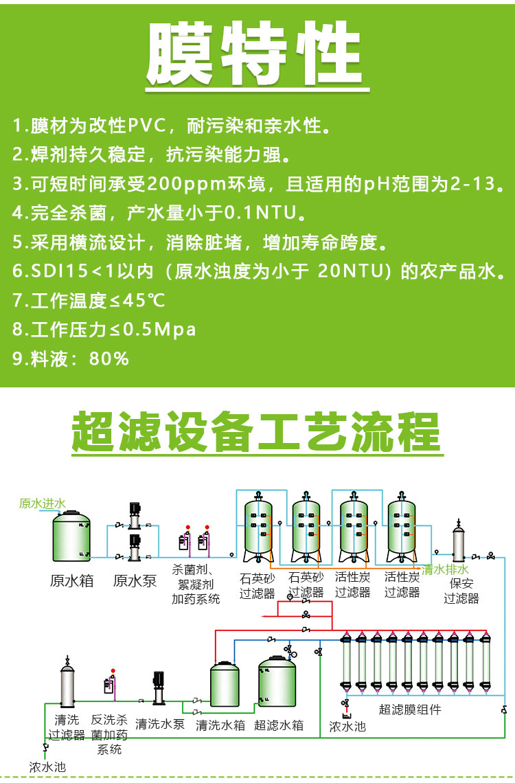 超滤(Ultra-filtration, UF)是一种能将溶液进行净化和分离的膜分离技术。超滤膜系统是以超滤膜丝为过滤介质,膜两侧的压力差为驱动力的溶液分离装置。超滤膜只允许溶液中的溶剂(如水分子)、无机盐及小分子有机物透过,而将溶液中的悬浮物、胶体、蛋白质和微生物等大分子物质截留,从而达到净化或分离的目的。