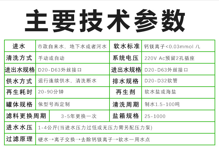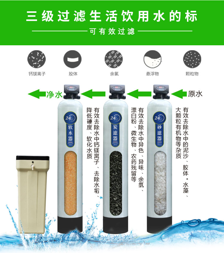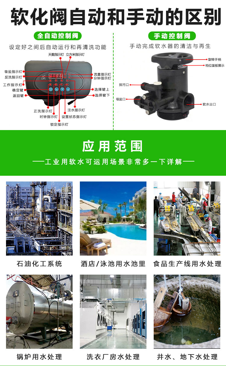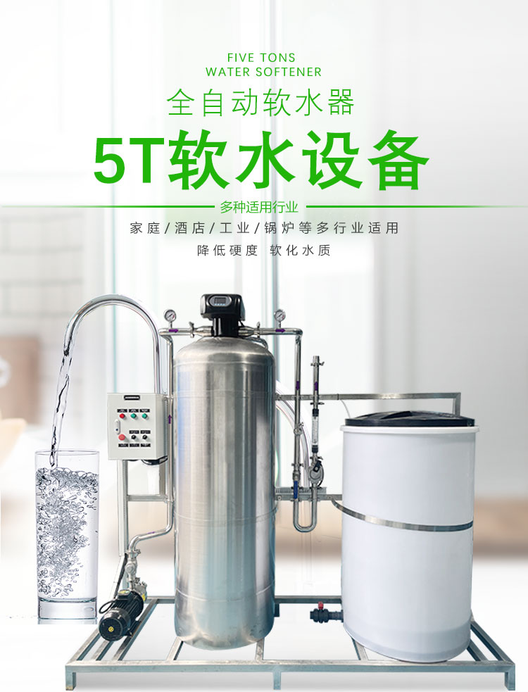 全自动软水器是一种运行和再生操作过程全自动控制的离子交换软水器,利用钠型阳离子交换树脂去除水中钙镁离子,降低原水硬度,以达到软化硬水的目的 从而避免碳酸盐在管道、容器、锅炉产生结垢现象。大大节省投资成本的同时又能保证生产顺利进行。已广泛应用于各种蒸汽锅炉、热水锅炉、热交换器、蒸汽冷凝器、直燃机等设备及系统的循环补给水中。此外还用作生活水处理,食品、电镀、医药、化工、印染、纺织、电子等工业水处理以及作为脱盐系统的前置处理。经过单级或多级软水器处理后的产水硬度可大幅度降低。