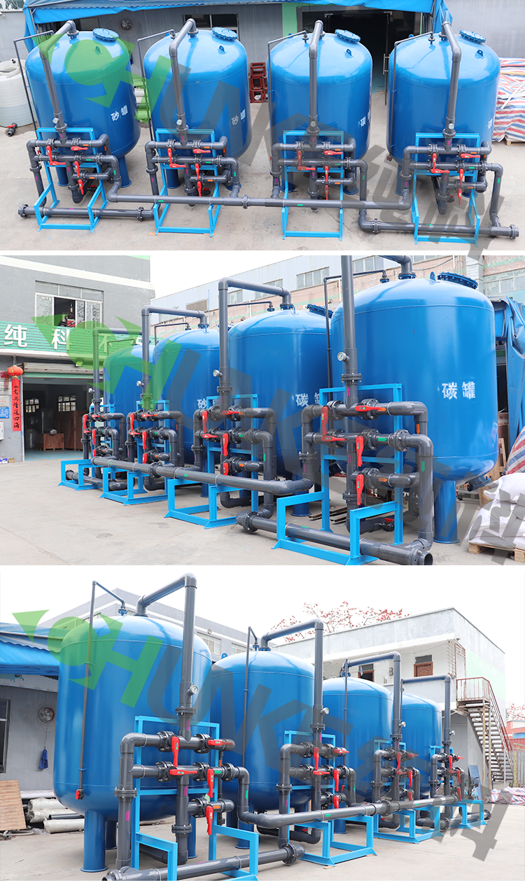 工作原理:前处理设备(又名多介质过滤器、活性炭滤器,软水器)。是一种压力式过滤器,利用过滤器内所填充的精制滤料,当进水自上而下流经滤层时,水中的悬浮物及粘胶质颗粒被去除,从而使水的浊度降低。